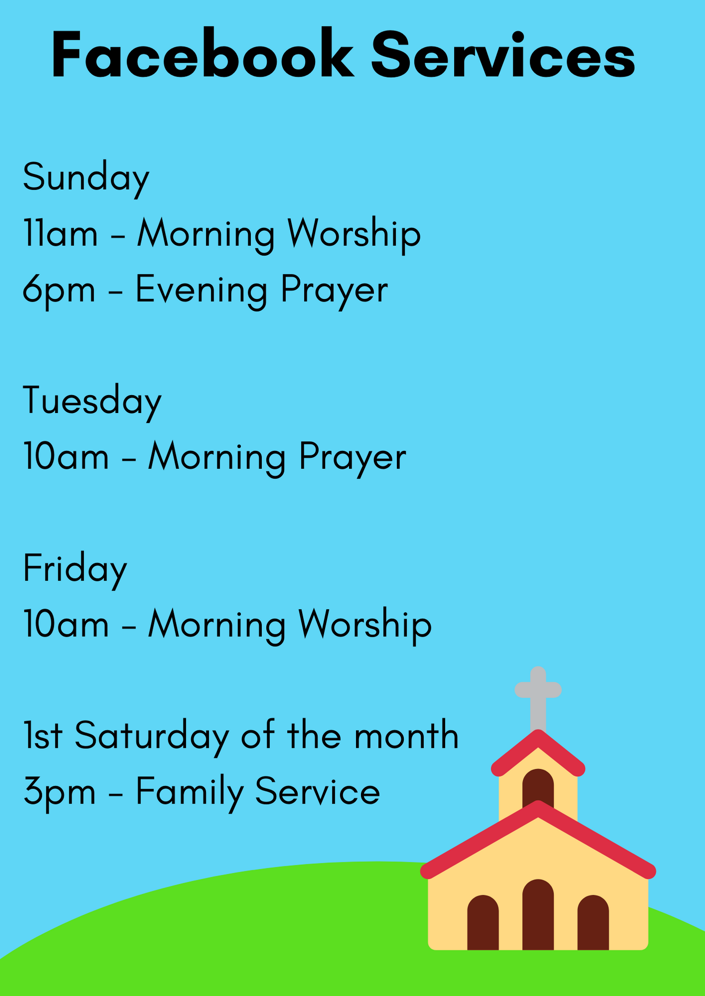 Facebook worship will follow our regular pattern of Sundays at 11am and 6pm, Tuesdays and Fridays at 10am, and a family service on the first Saturday of the month at 3pm.