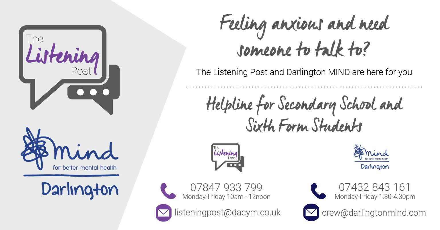 The Listening Post in conjunction with Darlington Mind are supporting young people through the current COVID19 situation by providing telephone support for any young person needing someone to talk to. If you know any young person who might benefit from having a chat do get in touch.